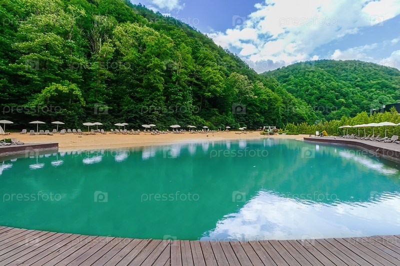 Россия, Краснодарский край, Сочи, Красная Поляна. Пляж на горном озере, курорт Роза Хутор