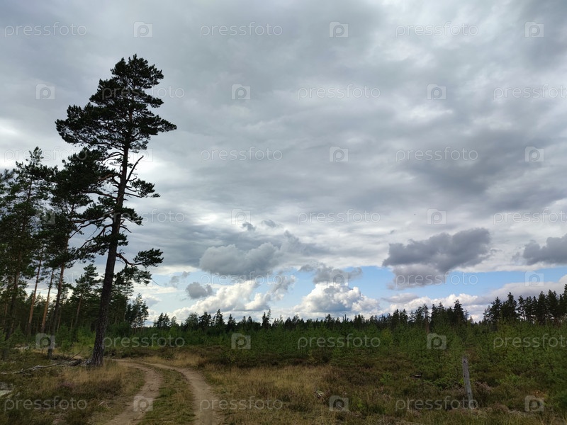 Молодой сосновый лес под серым небом