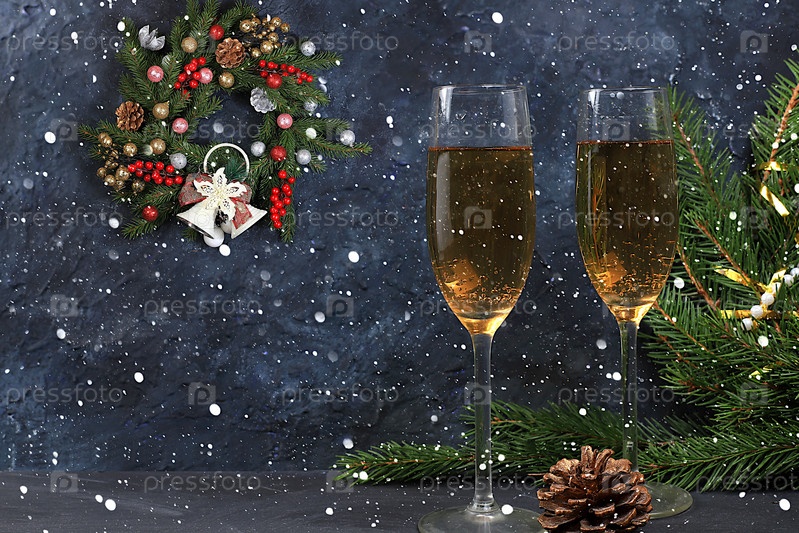 Шампанское и праздничные украшения, венок из еловых ветвей с колокольчиком на темном гранж-фоне, концепция Рождества и Нового года, место для текста. Новогодняя открытка, баннер для показа,