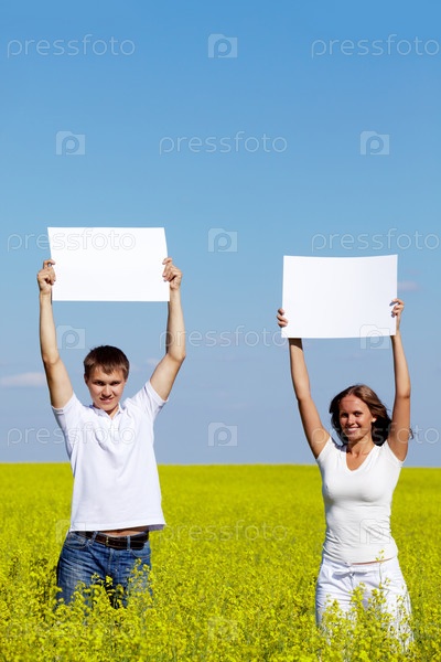 Парень с девушкой в поле с пустыми табличками в руках