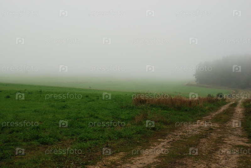 Зеленое поле в густом тумане