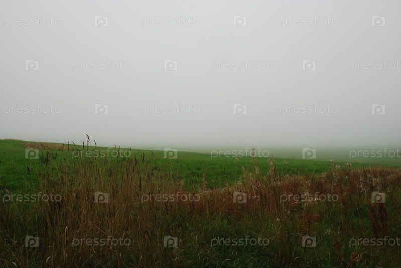 Зеленое поле в густом тумане