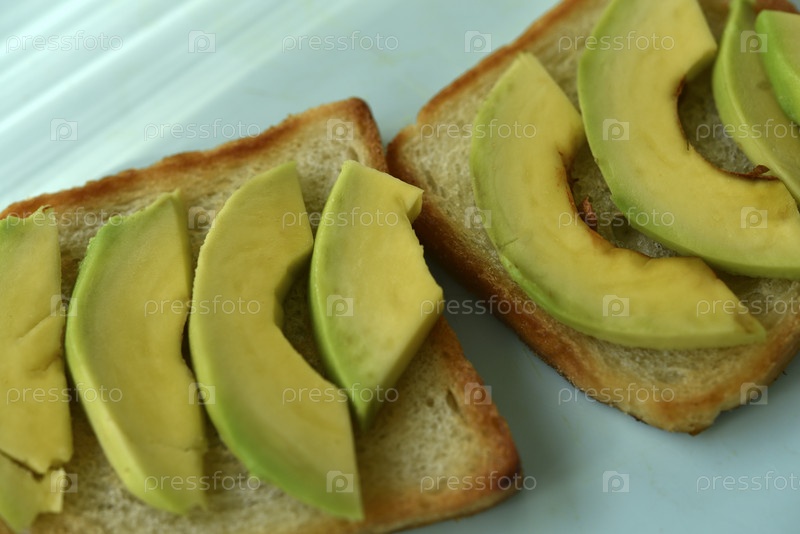 Жареный тост с кусочками зеленого авокадо. Вкусный обед из хлеба и спелого авокадо