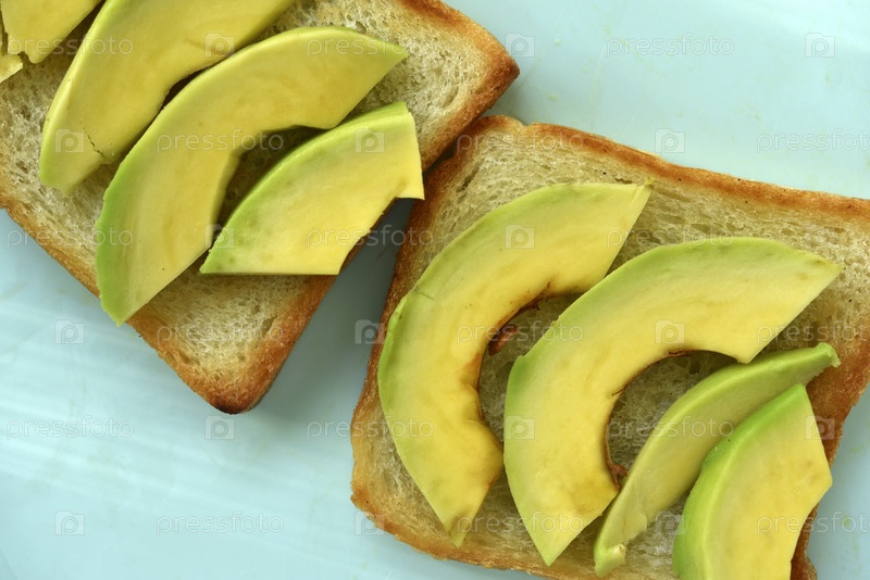 Жареный тост с кусочками зеленого авокадо. Вкусный обед из хлеба и спелого авокадо