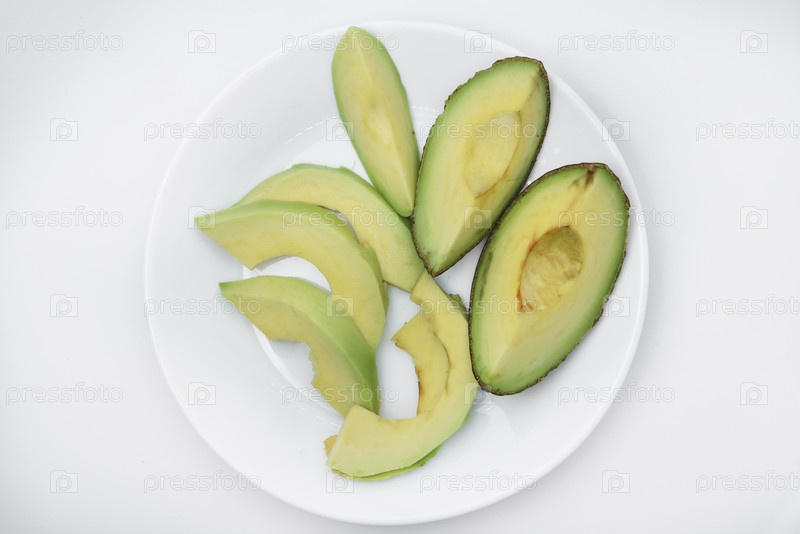 Нарезанные ломтики зеленого авокадо на кухне. Вкусный крупный план авокадо на блюдах