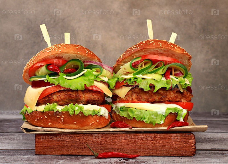 Два двойных чизбургера со свежим салатом, помидорами, сливочным сыром, огурцом, луком, перцем чили и котлетой на старой деревянной доске, концепция доставки еды, меню и реклама кафе и ресторана, выборочный фокус