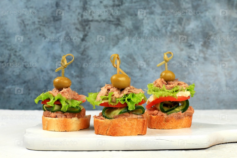 Набор закусок для праздничного стола. Канапе из помидоров, паштета, тунца, огурцов, оливок и салата на старом столе, концепция веганской еды, меню и реклама кафе, выборочный фокус рождественских и новогодних блюд