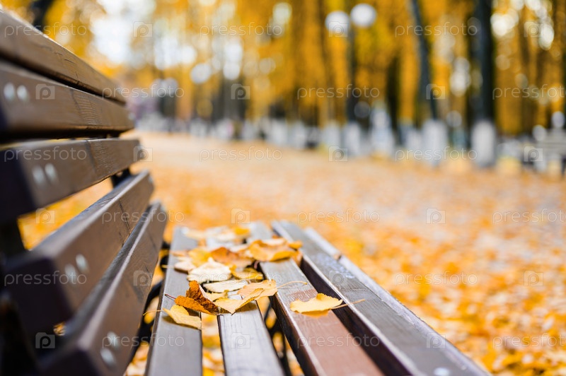 Осенняя листва на скамейке в парке. Узкий фокус, размытый фон