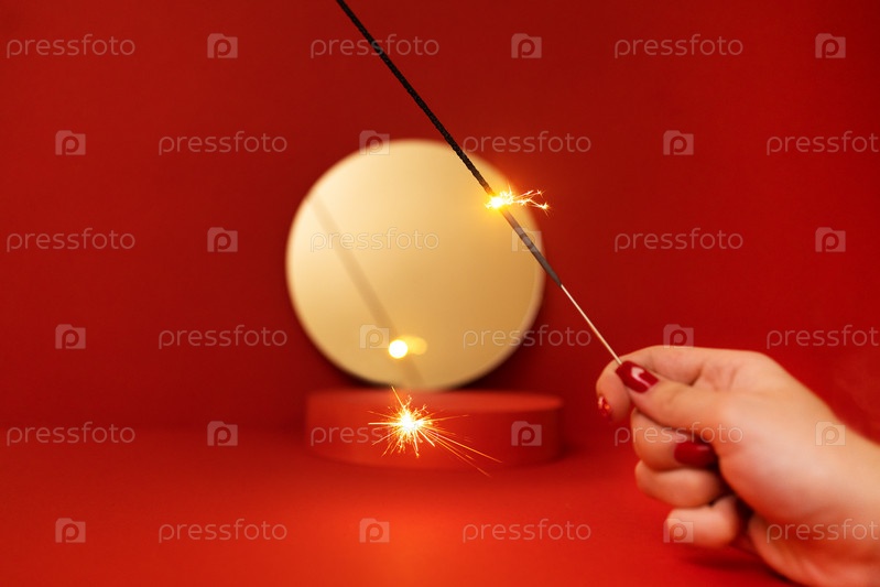 Зажженный бенгальский огонь в руке молодой женщины с красным маникюром. Красный подиум и круглое зеркало на заднем плане
