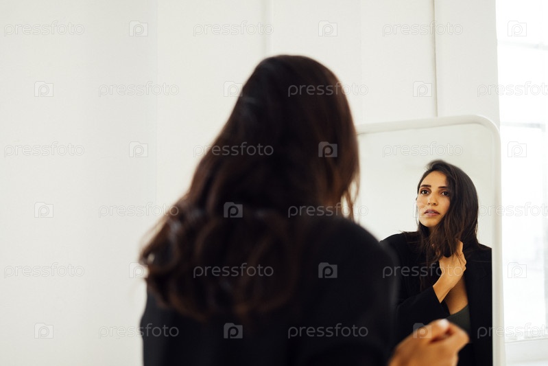 Отражение молодой женщины, ожидающей ребенка, в большом прямоугольном зеркале