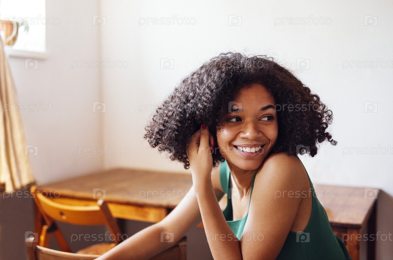 Крупный план портрета милой девушки смешанной расы, улыбающейся и держащей руку возле лица