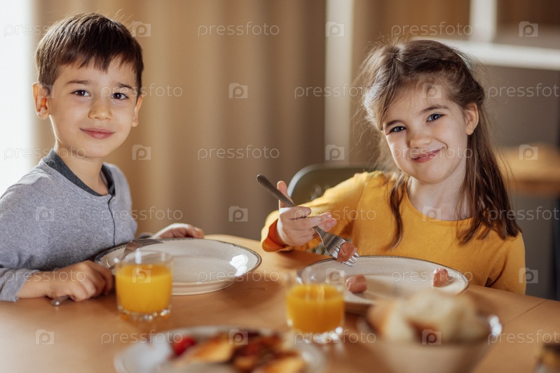 Двое маленьких детей сидят за обеденным столом и завтракают. Милые дети улыбаются и смотрят в камеру