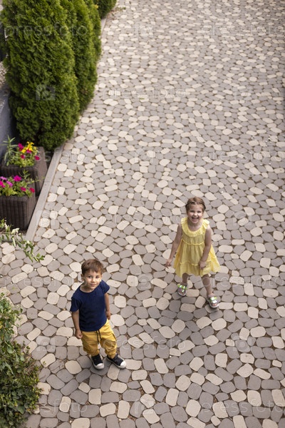 Маленькие смешные дети смеются и смотрят в камеру. Симпатичный мальчик и девочка в повседневной одежде веселятся в парке