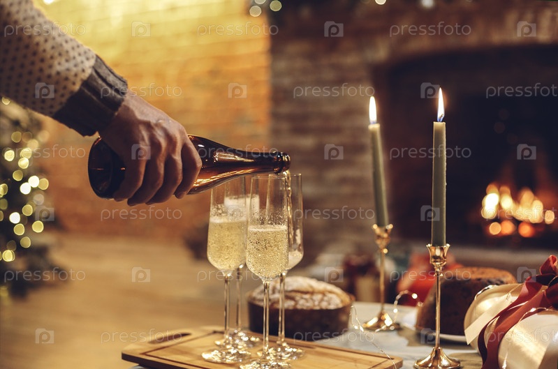 Празднование Нового года. Мужчина наливает шампанское в бокалы, стоящие на столе с праздничным рождественским ужином, свечами и завернутыми подарками на размытом фоне кирпичного камина