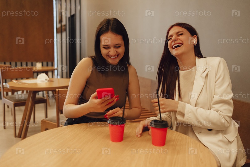 Подруги пьют кофе или чай из красных чашек с соломинкой