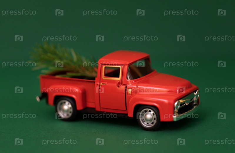 Красный игрушечный грузовик с рождественской еловой веткой в багажнике