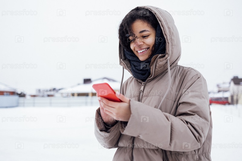 Молодая очаровательная африканская женщина в теплой повседневной одежде держит в руках красный телефон