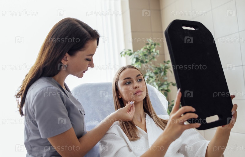 Врач проверяет кожу лица женщины в косметологической клинике перед пластической операцией