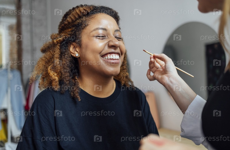 Кавказская блондинка-мастер делает макияж для своей темнокожей клиентки в салоне красоты