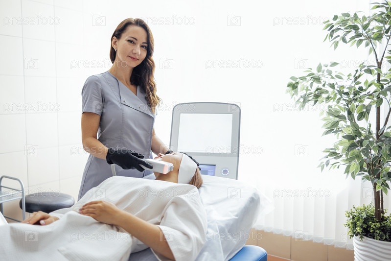 Портрет расслабленной молодой клиентки, получающей ультразвуковый лифтинг-массаж лица SMAS
