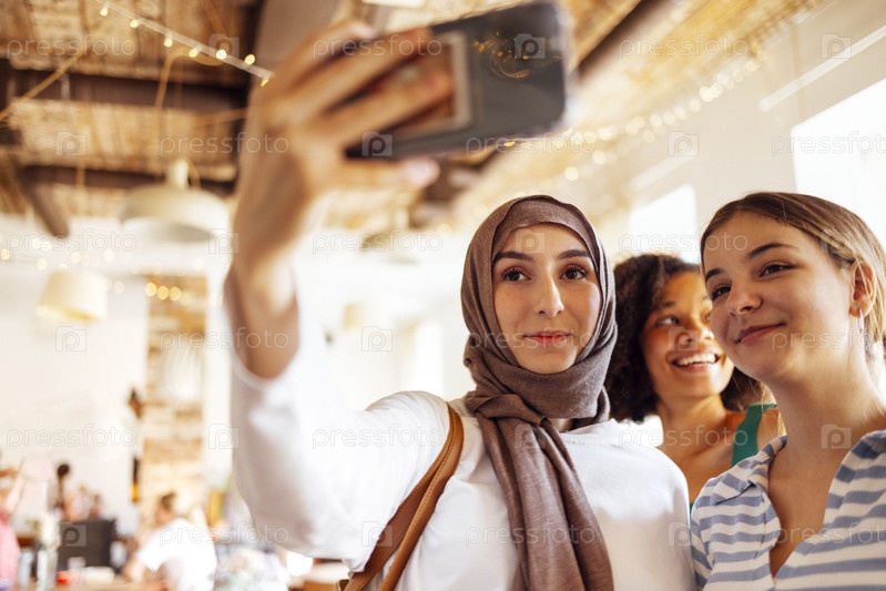 Кавказские, афроамериканские и мусульманские девушки-подростки фотографируются по телефону