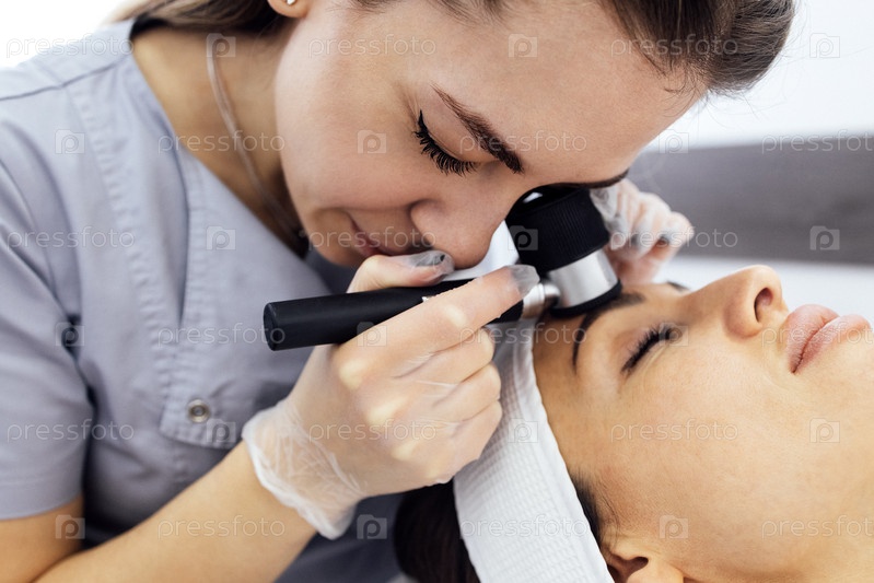 Врач-дерматолог осматривает кожу лица клиента салона красоты с помощью дерматологической линзы