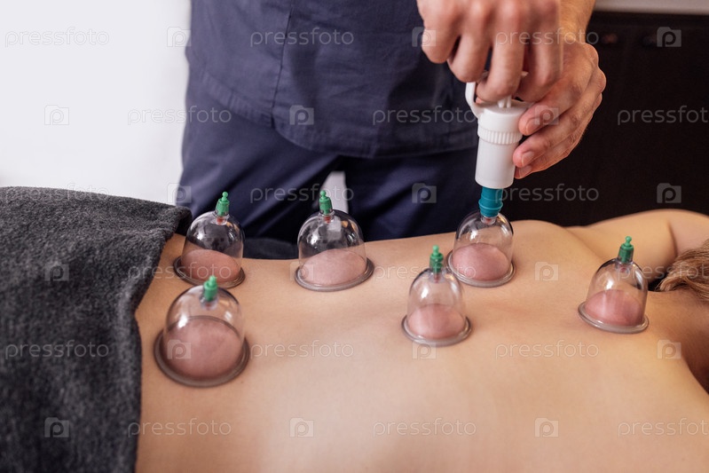 Крупный план мужских рук массажиста, кладущего вакуумные пластиковые лечебные банки на спину своей клиентки