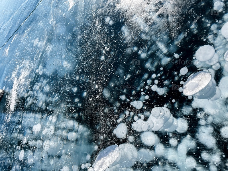 Текстура красивого голубого льда с трещинами и пузырьками воздуха в замерзшем озере
