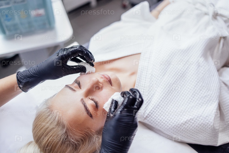 Молодая блондинка во время процедуры чистки лица в салоне красоты