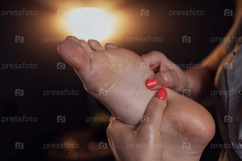 Крупный план женской стопы, получающей нежный массаж. Массажистка держит женскую ногу в руках. Молодой клиент лежит и наслаждается расслабляющей процедурой в салоне красоты. Санаторно-курортное лечение. Вы и уход за кожей. Копировать пространство