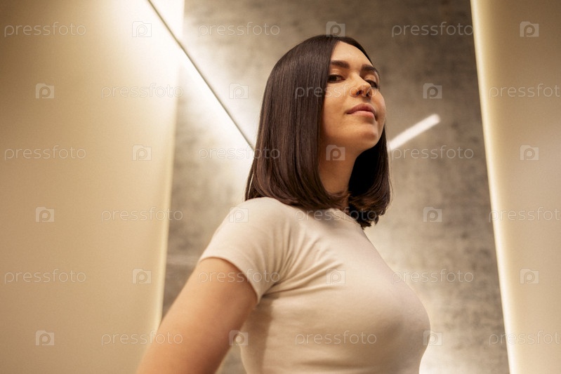 Крупным планом женский портрет привлекательной девушки поворачивает голову в сторону, и ее волосы развеваются