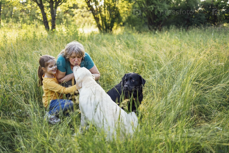 Седая бабушка и милая маленькая внучка вместе выгуливают собак в парке