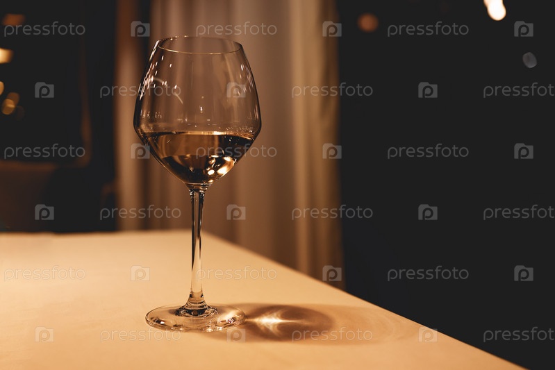 Один элегантный бокал белого вина на высокой ножке на светлом столе