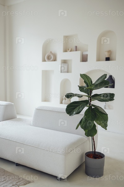 Фикус в форме лиры в горшке возле белого дивана в гостиной. Домашнее растение в стильном ярком интерьере
