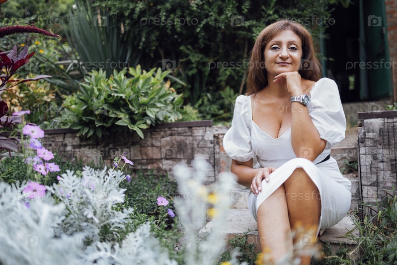 Улыбающаяся кавказская женщина средних лет смотрит в камеру и позирует