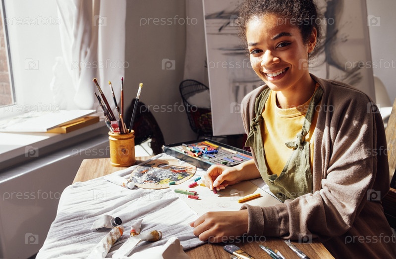Молодая творческая симпатичная африканская американская девушка-художница рисует пастелью, сидя за столом перед окном
