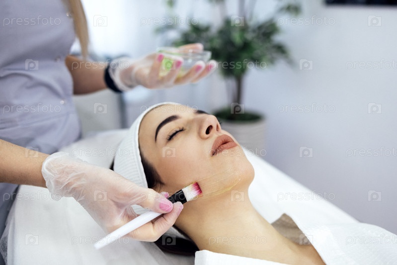 Мастер красоты наносит на лицо клиента омолаживающую маску