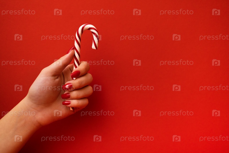 Рука молодой девушки с красным маникюром держит конфету. Палочка корицы или мяты на ярко-красном фоне