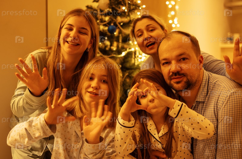 Большая семья в пижамах празднует Рождество дома в гостиной. Родители и их три дочери смеются, машут руками и делают сердечный жест