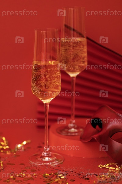 Два бокала шампанского на подиуме. Карнавальная маска и бумажный веер на ярко-красном фоне
