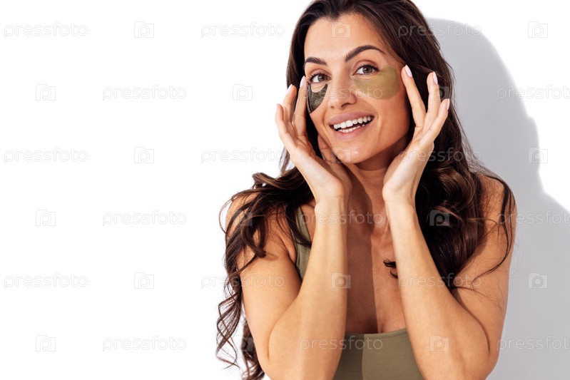 Красивая улыбающаяся кавказская женщина с двумя цветными пятнами под глазами. Молодая брюнетка на белом фоне