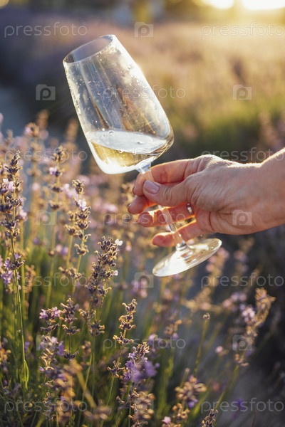 Крупный план женской белой руки, держащей бокал шампанского на фоне кустов с лавандой