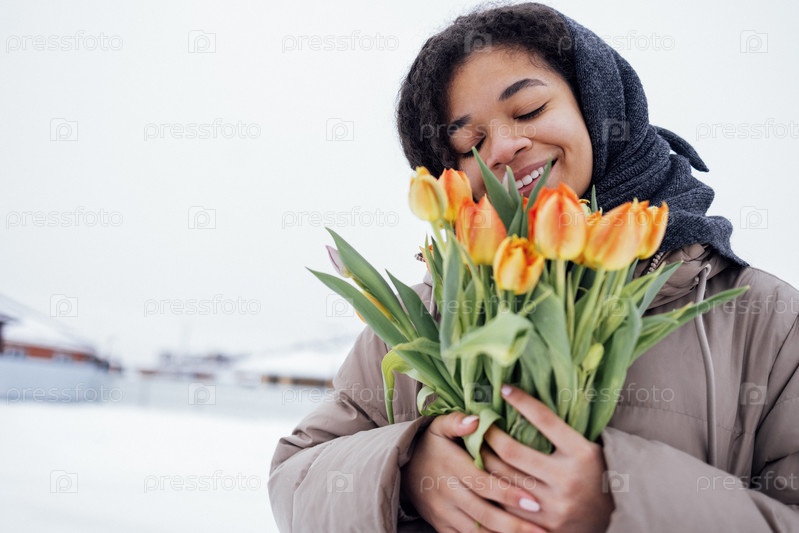 Молодая африканская женщина в теплой повседневной одежде держит букет оранжевых тюльпанов