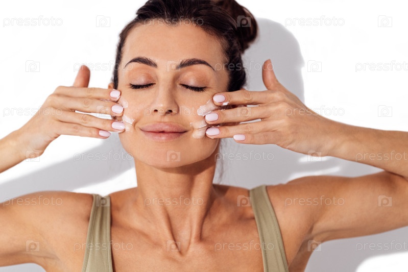 Красивая кавказская женщина мажет щеки кремом. Молодая брюнетка улыбается с закрытыми глазами