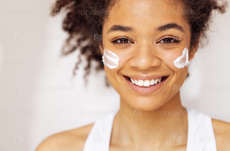 Крупным планом портрет смеющейся африканки с волнистыми волосами и красивой улыбкой, наносящей белый крем на щеки