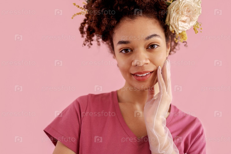 Счастливая молодая улыбающаяся женщина африканской национальности в розовой одежде, прозрачных перчатках и цветах