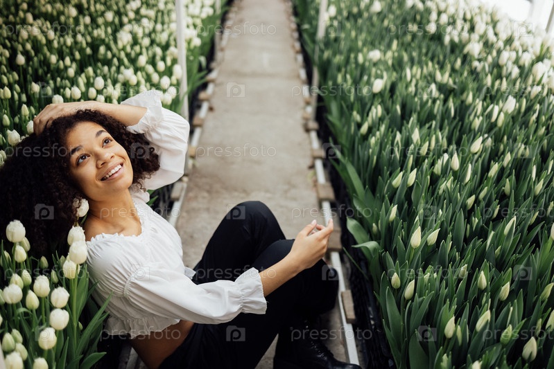 Женский портрет привлекательной темнокожей девушки, сидящей на тропинке среди тюльпанов в оранжерее