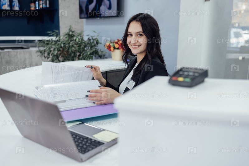 Офисная работница в черной куртке и белой рубашке работает с каталогом бумаг и ноутбуком