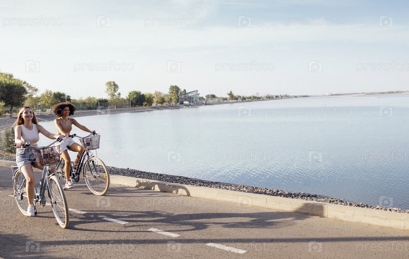 Подростки разных национальностей и внешности на велосипедах едут по улице города
