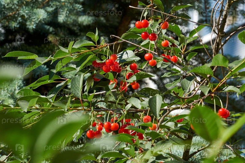 Плоды вишни на фоне голубого неба и зеленых листьев. В саду созревает вишня